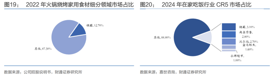 从市场集中度来看,行业呈现高度分散特征,提升空间广阔。根据嘉世咨询数据,2024年在家吃饭行业CR5市占率刚超过10%,公司以3.1%的市占率位居榜首,领先于高鑫零售(2.8%)、沃尔玛(2.7%)等竞争对手。在火锅烧烤家用食材细分领域,公司凭借先发优势与渠道规模,2022年市占率高达12.7%。