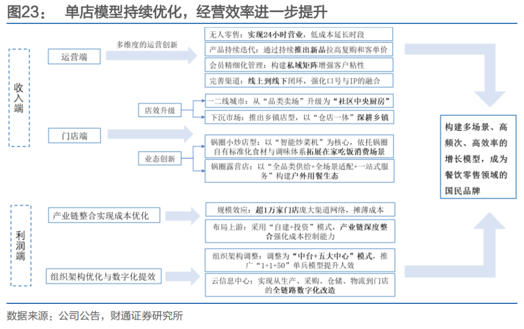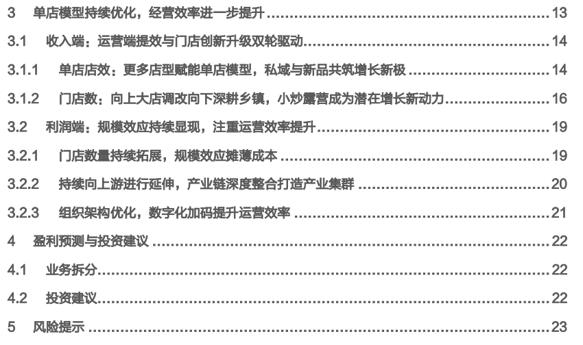 单店提效,多元拓新:存量提效、增量创新、供应链深扎三大主线,构筑公司未来增长核心。公司通过丰富品类,延长营业时间等提升单店收入;同时通过店型的多元化,扩展消费场景;最后通过供应链效率优化,提升盈利水平。