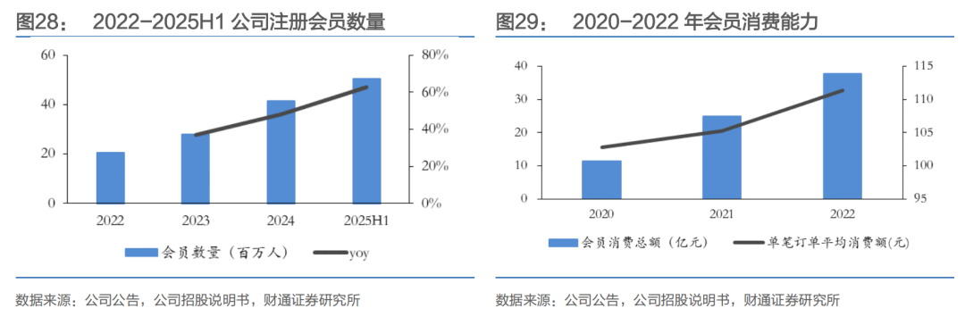3)会员精细化管理增强客户消费粘性:公司在会员运营上逐渐打造出一套比较成熟的打法,通过构建“公众号 小程序 企微 社群”的私域矩阵,以门店为载体强化社区互动,提升到店频次与活跃度。截止到2025年上半年,公司注册会员数量达到约5030万名,同比增长62.8%。公司继续围绕会员体系的建设,推动预付卡计划,截至2025年6月30日止六个月期间,预付卡预存金额达约人民币5.9亿元,同比增长37.2%