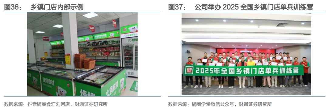 同时公司通过存量优化与增量拓展持续丰富店型矩阵,以提升单店店效。存量端,标准店通过新增高频品类、覆盖一日四餐及五星店长培训强化经营能力;乡镇店依托BC一体化与店仓模式加速复制,按“五年再造万店”战略提升渗透率。增量端,2024年推出“肴肴领鲜”以10-20平米小店切入农贸市场,同时探索“锅圈小炒”、酒饮便利店及户外、调味料等新业态,通过多场景、多客群覆盖推动门店模型持续迭代与店效系统性提升。