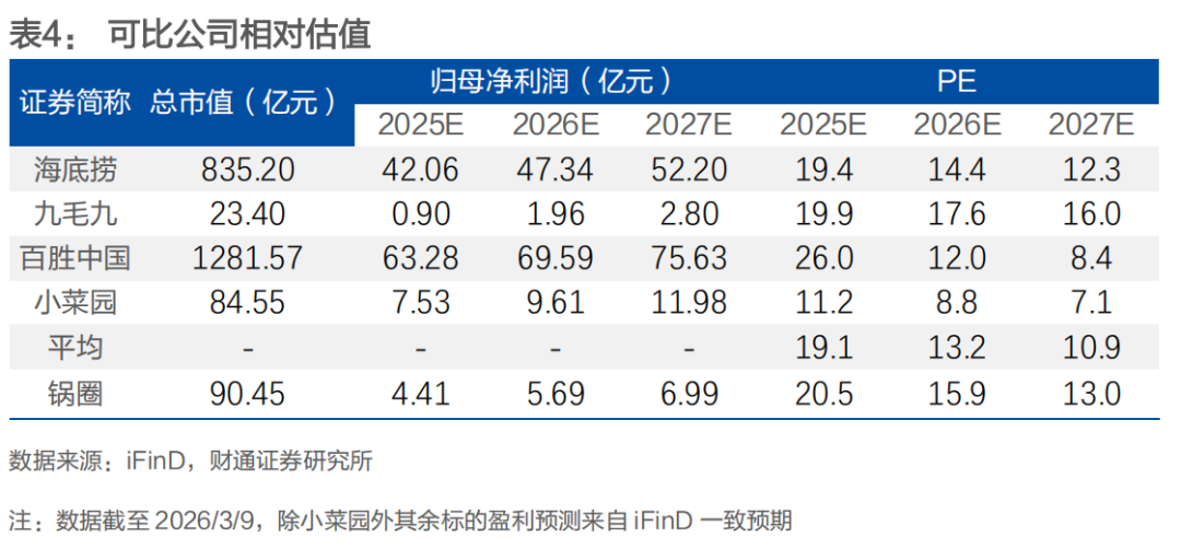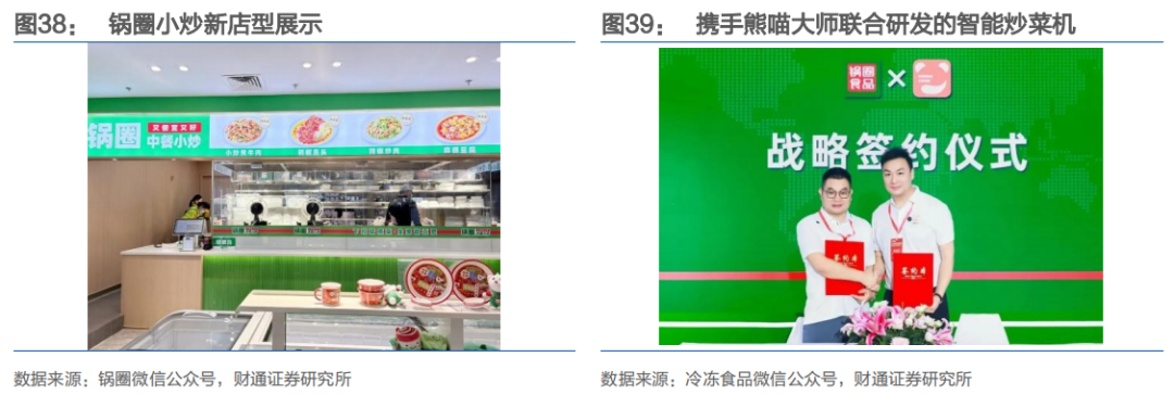 3)试点落地锅圈小炒店型,进一步拓展在家吃饭消费场景:2025年公司完成对四川熊喵智厨的数千万元级战略投资,以"智能炒菜机"为核心切入现制中餐赛道。首店于2026年1月6日在郑州试营业,标志着该模式进入试点落地阶段。该业态以标准化出品承接中餐外卖与"一人食/小家庭"场景,单台设备最快1分钟出餐,2-3分钟完成一道菜,一名操作员可同时管理3-6台设备,菜单以"高认知、高复购、高点单率"的国民菜品为核心,经多轮数据筛选形成覆盖全国畅销菜、本地特色菜和跨省特色菜的菜单池。我们认为"锅圈小炒"是公司在"社区央厨"战略下的关键延伸,以“智能炒菜机”为核心,依托公司自有标准化食材与调味体系,在社区场景为消费者提供现制中餐,有望成长为公司的第二增长曲线。