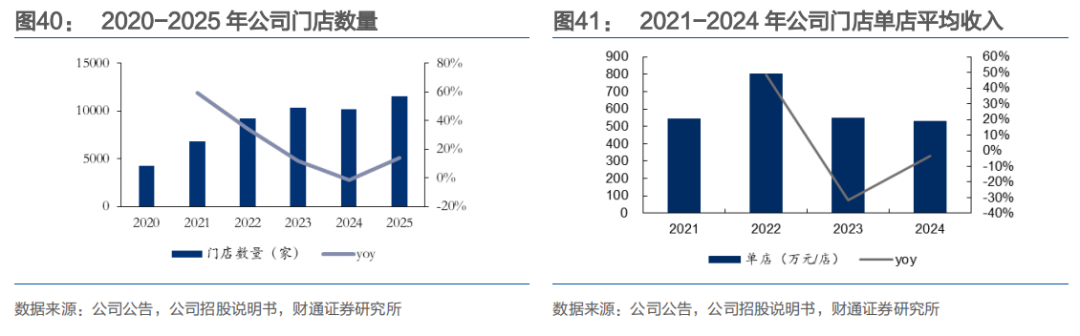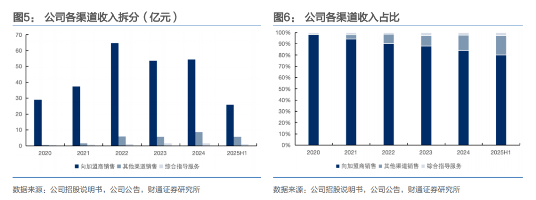 渠道结构上,向加盟商销售始终是核心收入来源,2020年该渠道收入29.1亿元、占比98.15%,2024年收入增至54.45亿元,占比降至84.16%,2025H1进一步降至80.12%。占比下降并非加盟渠道萎缩,而是公司销售渠道更加多元化。