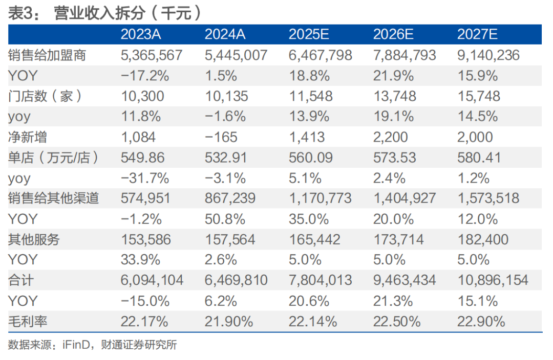 1)门店数:考虑到公司未来五年再开万店的规划,预计公司2025-2027年每年净开门店数分别为1413/2200/2000家,同比增长13.9%/19.1%/14.5%。