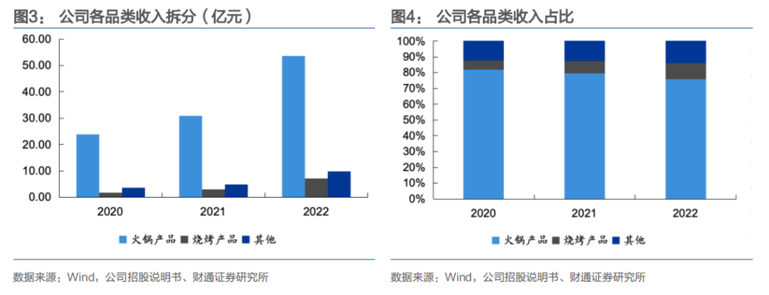 公司通过“火锅 烧烤”的品类组合,快速占领市场,进而建立供应链与门店网络的壁垒。火锅产品是绝对主力,收入从2020年23.90亿元增长至2022年53.52亿元,收入占比虽然从81.90%降至75.82%,但仍贡献超七成收入;烧烤产品则实现快速增长,从1.70亿元升至7.14亿元,占比从5.84%升至10.12%,与火锅形成“双品类互补”,覆盖“火锅 烧烤”的居家聚餐核心场景;其他产品(饮品、一人食等)从3.58亿元增至9.93亿元,是公司从“单一品类到全场景家庭食材”的初步尝试。