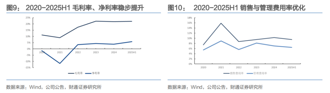 盈利能力稳步攀升,受益供应链优化与规模效应释放,公司毛利率与净利率同步上行。毛利率2020-2021年维持10%左右低位,2022年跃升至17.41%,2023-2025H1稳定在21%-22%区间;净利率也随毛利率的提升持续改善,2022年升至3.36%,2025H1进一步提升至5.86%。