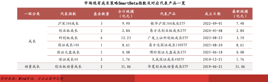 市场现有成长策略SmartBeta指数基金包括成长和动量成长2个细分类型。截至2025年末,成长、动量成长策略指数基金数量分别为15只和2只,合计规模35.38亿元/31.06亿元。