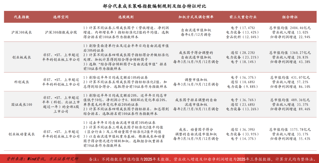 现有成长策略指数多以主流宽基指数(沪深300、创业板指、科创板指等)为基础,加入营收增速、净利润增速等成长因子指标进行指数设计。