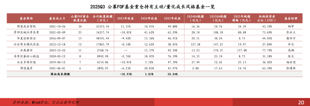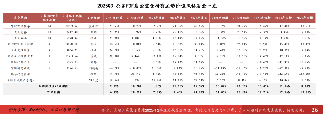 价值风格方面,公募FOF基金长期持有绩优价值风格主动权益基金作为组合底仓进行配置。以上基金牛市行情中大多表现一般,部分产品2025年收益跑输中证全指,但在震荡市和熊市中的表现均极为稳健,收益及最大回撤均明显优于市场指数。