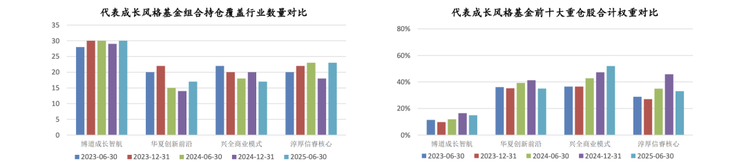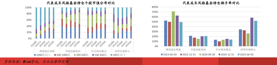 量化成长风格代表基金博道成长智航行业覆盖极广(覆盖25-30个行业)、组合集中度低(CR10在15%左右)、市值极度下沉(100亿以下小盘股权重50%左右)、换手率高(半年换手率5倍左右);三只主动成长风格基金大多覆盖15-20个行业,前十大重仓股权重在30%-40%之间,市值分布相对均衡,不同市值区间个股均有覆盖,不同时期不同产品半年换手率从1倍到5倍不等。
