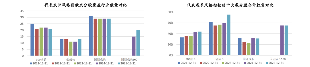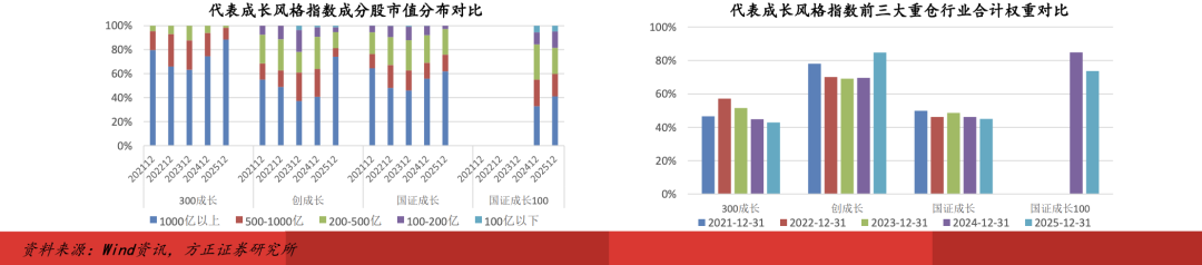 对比而言,300成长/创成长/国证成长100指数行业覆盖数量偏少、重仓行业及个股集中度高、大中市值特征明显,主要是由于指数成分股数量较少(50只或100只),且多采用市值或调整市值加权方式,大市值成分股权重占比远高于中小市值成分股。