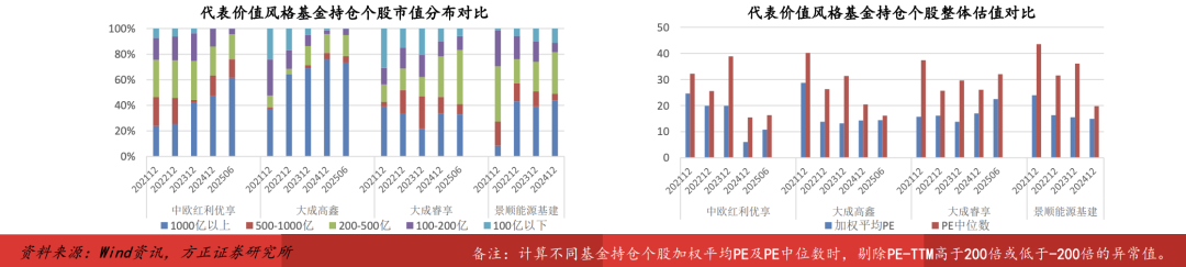 四只主动价值风格代表基金大多覆盖20-25个行业,除中欧红利优享外,其余三只基金对银行、非银金融行业个股几无覆盖;大成高鑫组合持仓以大市值股票为主,其余三只基金市值分布均相对均衡,市值500亿元以下的中小市值股票占比在50%左右;持仓个股PE-TTM中位数大多在20倍以上,个别重仓个股PE-TTM超过50倍。