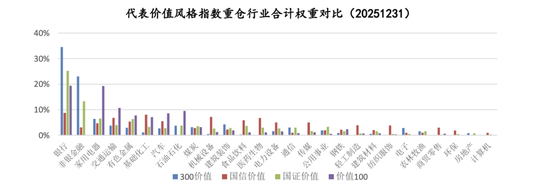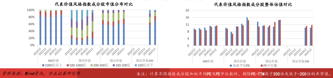 对比而言,300价值/国证价值/国证价值100指数在银行、非银、家电、交运等少数行业的权重暴露极为集中,大市值特征十分明显,主要是由于以上行业整体估值明显低于其他行业,且个股多为大市值标的,市值或调整市值加权规则下权重高度集中。