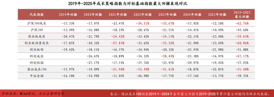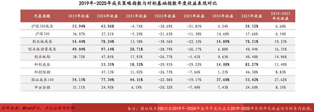 基础指数行情上涨时,成长策略指数凭借在高成长行业或个股上的高权重暴露,大多可实现超越基础指数的更高业绩弹性。2019年、2020年、2025年牛市行情中,沪深300成长、创业板成长、创业板动量成长、科创成长均大幅跑赢沪深300、创业综指、科创综指等对标基础指数,部分年份超额收益在20%以上。
