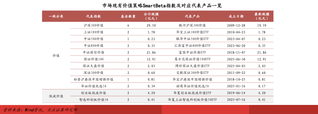 市场现有价值策略SmartBeta指数基金包括价值和低波价值2个细分类型。截至2025年末,价值、低波价值策略指数基金数量分别为22只和4只,合计规模70.42亿元/4.61亿元。