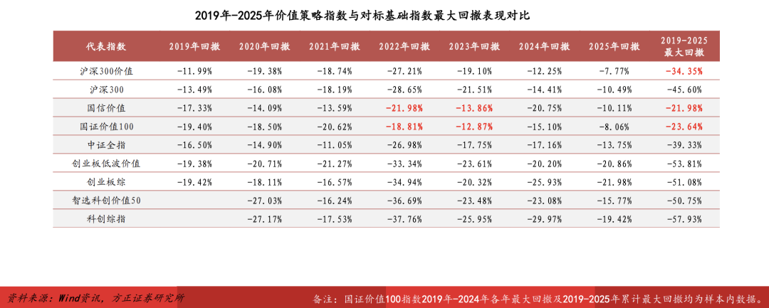 基础指数行情上涨时,沪深300价值、国信价值、国信价值100等价值策略指数表现一般,业绩弹性低于对标基础指数;但在熊市或震荡市行情中,以上价值策略指数凭借成分股在低估值及高基本面质地的保护,体现出来较强的抗跌能力,亏损及回撤幅度明显低于对标基础指数。