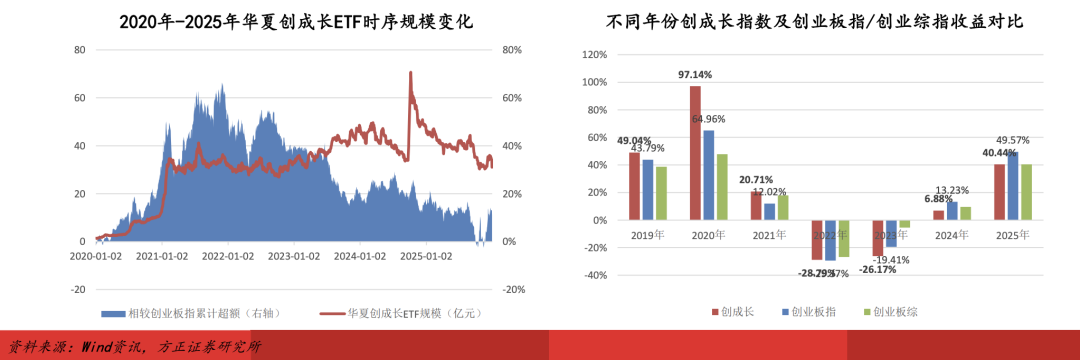 华夏创成长ETF的规模变化同创成长指数相较创业板指的超额收益高低存在显著正相关性。2020年和2021年,创成长指数收益高达97.14%/20.71%,跑赢创业板指32.18%/8.69%,产品规模从2020年初的1.49亿元大幅增至2021年末的32.37亿元,期间最高规模达41.21亿元;在此之后,产品规模长期维持在30-40亿元之间。2024年“924行情”阶段,产品规模快速增长至70.72亿元;但随着2025年创成长指数超额收益不断收敛,产品规模一路下滑至31.06亿元,年内规模减少了15.78亿元。