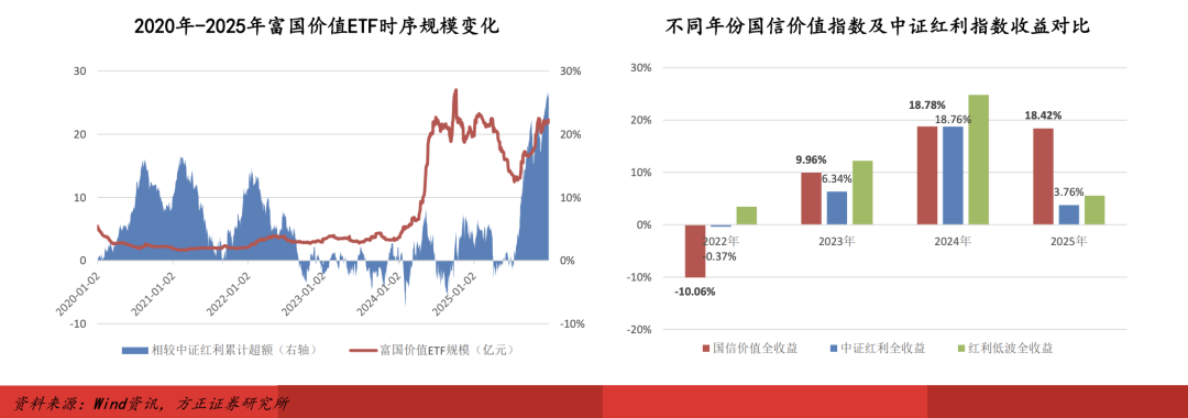 与之类似,富国价值ETF的规模变化同国信价值指数相较中证红利指数的超额收益高低存在正相关性。2020年-2023年,受市场风险偏好及产品认知的影响,产品规模长期处于5亿元以下;2024年3-4月,中证红利指数表现偏弱,同期国信价值指数强劲上涨6.72%,超额收益近5%,产品规模快速增长至20亿元以上(最高规模27.02亿元);2025年以来,随着国信价值指数超额收益的波动,产品规模先降后升,年末规模为21.86亿元。