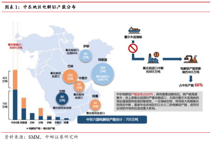从整体区域供给格局看,中东六国(伊朗、沙特、阿联酋、巴林、卡塔尔、阿曼)合计705万吨,2025年产量692.7万吨,占全球电解铝产量9%,基本都处于地缘冲突的核心区域,未来或有可能陆续受到影响。