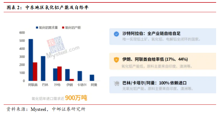 中东地区氧化铝建成产能为455万吨/年,产量为449.2万吨/年,进口需求接近 900 万吨/年,区域氧化铝自给率仅33%,其中仅沙特具备185万吨/年氧化铝产能,可以完全自给,其他国家不同程度的依赖进口,氧化铝原料高度依赖外部海运补给。