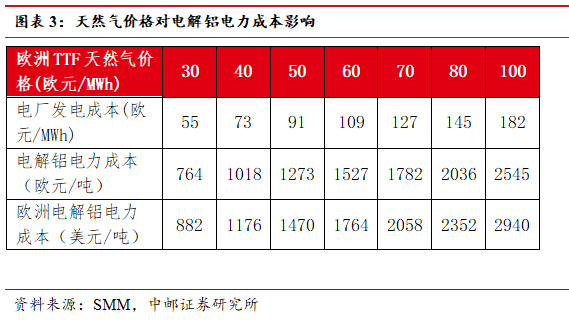 西欧、南欧部分国家依赖天然气发电生产电解铝,是全球电解铝成本最高的区域之一。中东冲突以来,天然气价格暴涨,欧洲TTF天然气期货价格一度突破61欧元/MWh,带动发电成本提升,以50-60欧元/MWh的天然气价格计算,吨电解铝电力成本上涨至1470-1764美元/吨,显著高于前期600-900美元/吨的水平。