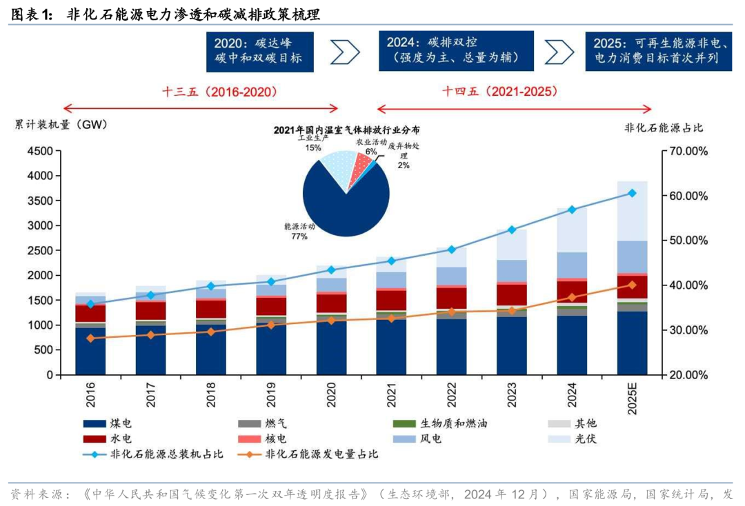 25年10月政策首提非电可再生能源消费比重目标,有望成为十五五碳减排新抓手。复盘我国碳减排政策规划路径,2020年我国提出2030/60年“双碳”目标,基于能源行业高碳排特征(根据《中华人民共和国气候变化第一次双年透明度报告》,以2021年为例,中国能源活动温室气体排放为110.07亿吨二氧化碳当量,占我国总温室气体排放的77%),十四五期间,减排政策主要围绕电力领域可再生能源消费目标展开:即通过可再生能源替代传统化石能源发电,引导电力部门结构性降碳。截至2024年底,我国非化石能源占电力总装机和总发电量比例已经达到57%/37%。25年10月,国家发改委下发《可再生能源消费最低比重目标和可再生能源电力消纳责任权重制度实施办法(征求意见稿)》,机制上首次将可再生能源电力消费和非电消费比重目标并列。该机制延续9月联合国气候变化峰会“全经济范围”控排思路,意味着非电可再生能源消费首次被纳入减排框架。