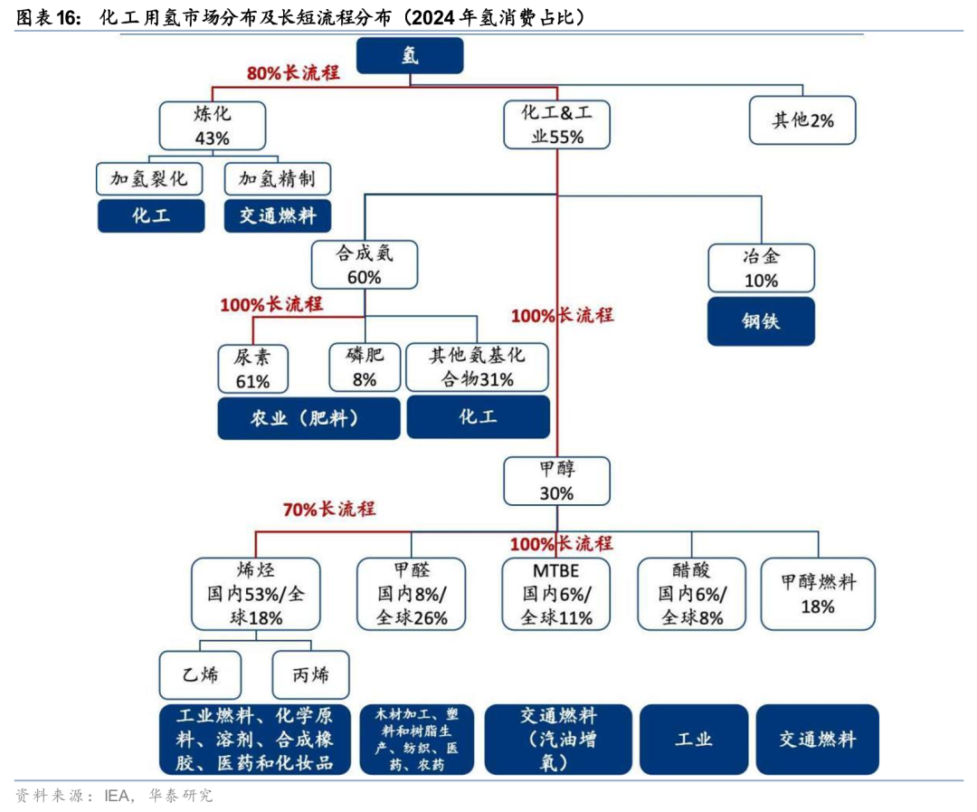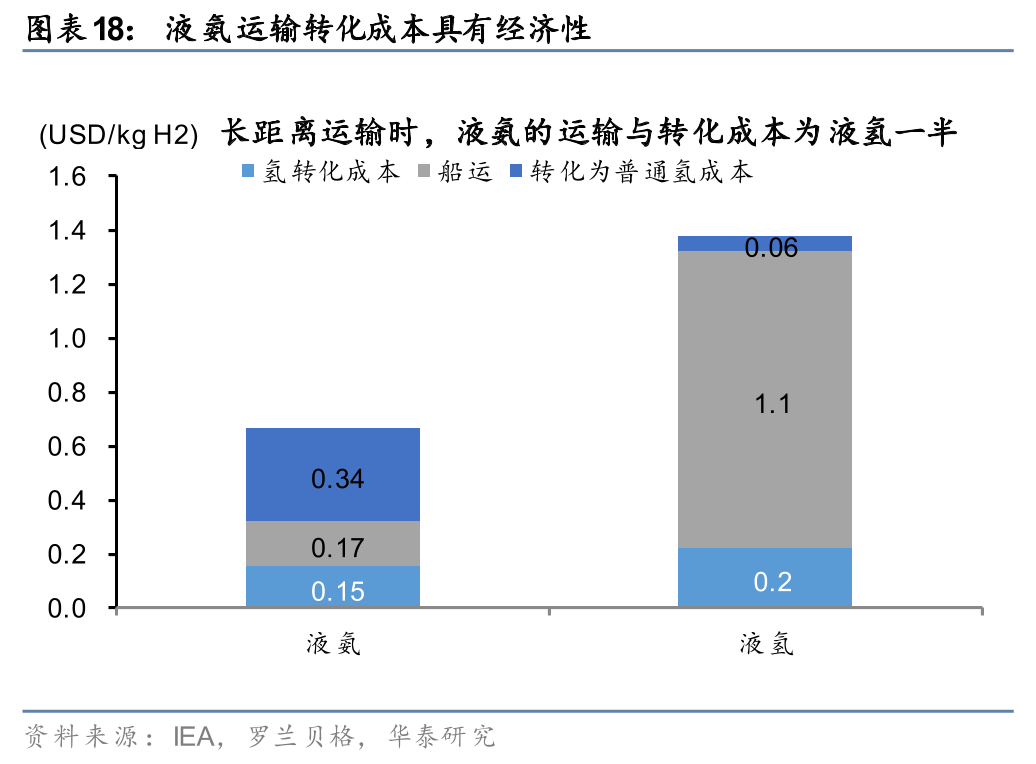 化工领域作为氢气最大的需求方向,合成氨和炼化绿氢替代有望成为产业突破口。根据IEA,2024年全球氢需求约1亿吨,其中石油炼化、合成氨、合成甲醇分别贡献4300、3300、1650万吨。我们认为合成氨和炼化有望率先实现产业应用。合成氨的绿氢替代经济性相对较优(绿氢替代路径下合成氨相比传统路线成本高38%,v.s.合成甲醇95%),且氨本身兼具长距离、长时间储运能力,在绿氢产业化初期更易形成规模化替代和商业闭环。传统石油炼化通常采用天然气制氢(短流程)或工业副产氢(长流程),工业副产氢炼化路线作为一体化长流程,物料平衡、输入输出更为复杂,因此绿氢更可能作为天然气制氢路线的替代方案。绿色甲醇由于相对传统煤制甲醇成本溢价较高,主要受全球碳排政策收紧带来的船用绿色甲醇需求驱动,我们将在后文进行详细讨论。