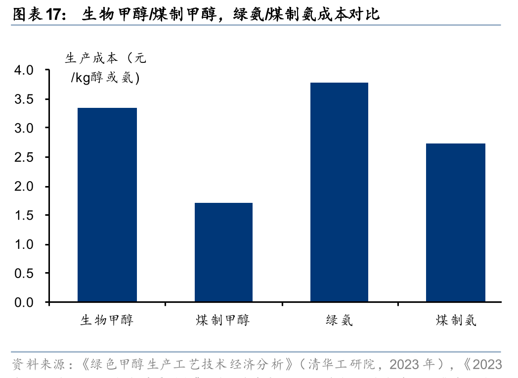 绿氢作为构建绿氢氨醇产业体系的基础要素,其成本不仅决定自身经济性,也直接影响下游衍生产品的生产成本。我们在2024年3月17日发布的《氢能的2.0时代到来》的报告中,已详细梳理绿氢主要衍生品(包括生物甲醇、电甲醇、绿氨)的生产技术路线,从结论来看,由于氢气来源及碳源利用方式的差异,生物甲醇、电甲醇产出的氢耗量约为0-0.19 kg氢气/kg甲醇之间波动;绿氨单位产出所需理论氢耗为0.176 kg氢气/kg氨,考虑工业运行条件,实际氢耗通常在0.18-0.20 kg氢气/kg氨之间。我们测算,绿氢在生物甲醇、电甲醇、绿氨生产成本中占比分别为58%/47%/75%,是当前制约下游其经济性的核心环节。