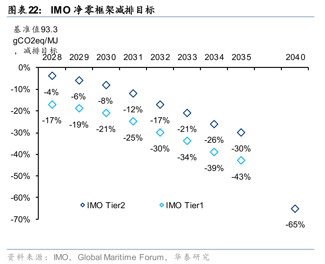 2. IMO净零框架有待2026年10月进一步表决,全球船舶减排有望向统一标准迈进。国际海事组织(IMO)于2025年4月就全球船运适用的净零框架(Net-Zero Framework)达成一致意见。该框架计划于2026年10月重新进行表决。若表决通过,根据IMO时间线预计将于2028年正式生效,并自2029年起进入实质性合规执行阶段(原定的表决、生效及执行时间分别为2025年10月、2027年和2028年)。IMO规定适用于全球所有总吨位超过5000吨的船舶(对部分特定类型,如非机械推进船舶、半潜式平台等特定船舶给予豁免)。框架设定了2028-35年的温室气体燃料强度减排目标,提供两条减排路径:基础Tier-2路径和更激进的Tier-1路径,均以2008年93.3 gCO2eq/MJ为基准。其中,Tier-2目标到2040年实现65%的减排。IMO设计了盈余单位交易机制:船舶可将超额减排量用于出售或未来抵扣,Tier-2和Tier-1盈余单位定价分别为380和100美元/tCO2eq,从而鼓励更多船舶参与基础Tier-2减排。