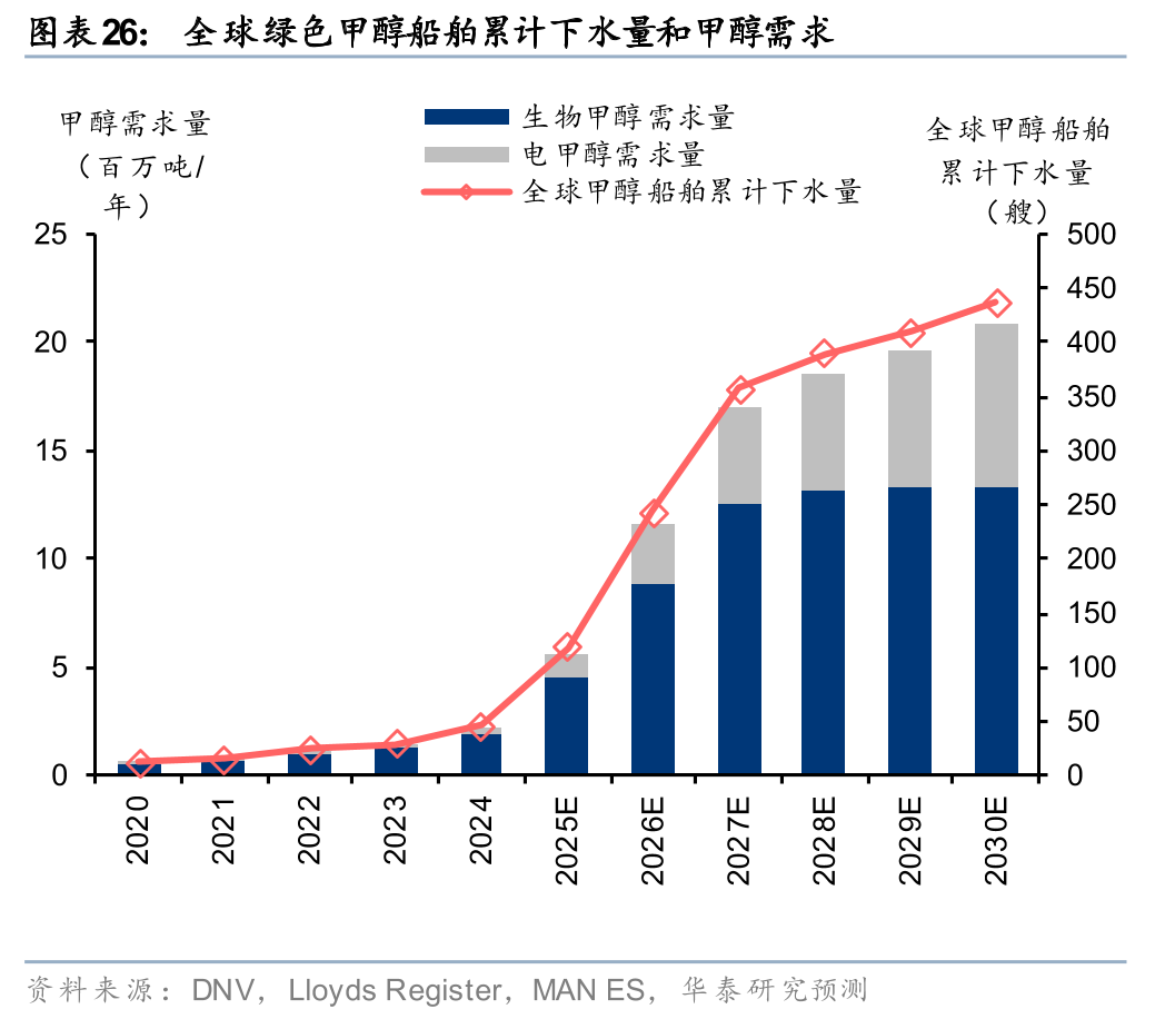 船运减排政策收紧加速行业向低碳燃料转型,甲醇船舶订单已呈现快速增长趋势,我们预计到2030年全球绿色甲醇船舶累计下水量将达到437艘,对应绿色甲醇20.83百万吨/年,有望拉动绿氢需求2.15百万吨/年。截至2024年底,尽管在役船舶中新型燃料船(包括LNG、LPG、甲醇、氢能、绿氨)占比仍不足1%,但新签订单中新型燃料船占比已超过15%,其中甲醇燃料船增长斜率陡峭。根据DNV披露的绿色甲醇船舶在运及订单数据,并根据DNV估算的订单兑现节奏,预计2030年全球绿色甲醇船舶累计下水量为437艘,较2024年46艘显著提升。基于甲醇船舶下水数量预测、以及MAN ES船舶燃料消耗量,我们预计2030年全球绿色甲醇需求量达20.83百万吨/年,根据生物甲醇0.06kg氢/kg甲醇、电甲醇0.19kg氢/kg甲醇的氢耗量假设,甲醇船舶有望拉动2030年绿氢需求2.15百万吨/年。