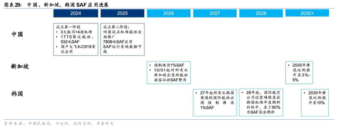 3. 中国民航局已于2024年启动全国SAF应用试点,新加坡、韩国设定SAF中长期目标。中国SAF试点划分两个阶段推进,第一阶段为2024年9月至12月,由国航、东航、南航三大航司牵头,在北京大兴、成都双流、郑州新郑、宁波栎社四座机场开展示范运行。根据中国民航局及中证网披露,2024年9月至2025年2月,中国航油联合三大航司在上述机场的12条航线上实施SAF常态化加注,累计完成1770架次航班、532吨SAF使用,并首次完成SAF在国产大飞机C919商业航班上的安全应用。第二阶段覆盖2025年全年,政策重心由技术与安全验证转向规模化运营能力测试。其中,2025年3月至6月,SAF在四座试点机场全面推广至所有航班,试点期内累计完成约7808吨SAF应用。此外,新加波政府提出自2026年起强制使用1%的SAF,并计划到2030年将掺混比例提升至3%-5%。韩国政府规定自2027年起,所有从韩国离境的国际航班必须强制掺混1%的SAF,并计划至2035年逐步提升至10%。