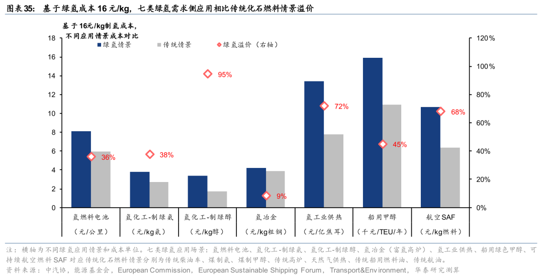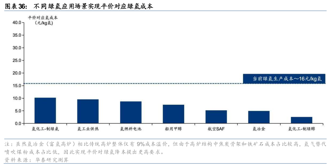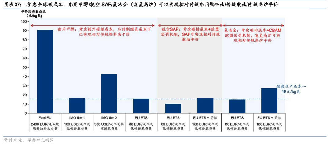 3. 船用甲醇、航空SAF、氢冶金、氢化工-制绿醇实现平价较为困难,需额外引入碳成本。我们测算,无政策因素下,船用甲醇、航空SAF、氢冶金(富氢高炉)、氢化工-制绿醇相比传统船用燃料油、传统航油、传统高炉、煤制甲醇平价对应的制氢成本为7.5、5.2、5.0、2.6元/kg,平价较为困难。考虑额外碳成本,以船用甲醇为例,Fuel EU、IMO Tier 1、IMO Tier 2、EU ETS对碳排放余额(不足)的交易价格(罚金)分别约为896、100、380、93 USD/tCO2;四类碳成本情景下若绿色甲醇较燃料油实现平价,则对应制氢成本分别为91、17、43、16元/kg,意味着当前16元/kg制绿氢成本下船用甲醇已经平价。航空SAF、氢冶金在ETS 额外100欧元/吨罚金情景下亦可实现经济性打平,若仅考虑ETS(无额外罚金)则航空SAF、氢冶金平价对应制氢成本需降至10、15元/kg,相比无政策情景的平价潜能亦显著提升。