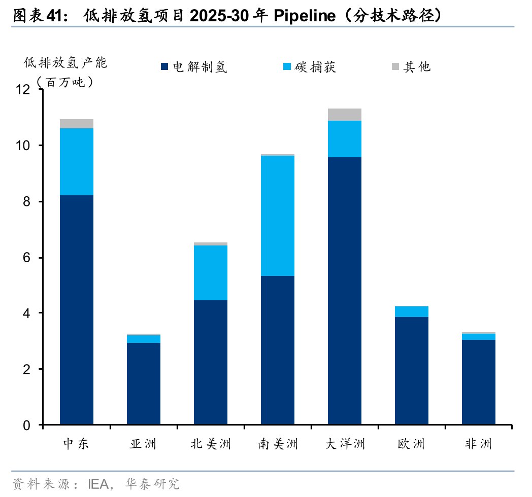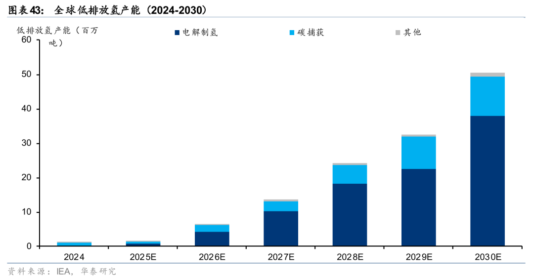 中国绿氢产能规划已实现全球领先。根据IEA,截至2025年9月,全球低排放氢项目在运总产能119万吨(产能统一按氢气吨口径,下同),其中电解制绿氢贡献43万吨。结合IEA全球氢氨醇项目的投运时间线和发展阶段,预计当前在建、示范、可行性研究阶段的项目储备在2030年前将贡献额外4914万吨低排放氢产能(不包括仍处概念阶段的项目),其中电解制绿氢新增3737万吨,占比超75%,2024-30年全球低排放氢、电解制绿氢产能CAGR有望达91%、128%。从终端应用来看,氢和氨分别占新增产能的47%和41%。中国凭借成熟的绿氢制备技术和供应链优势,绿氢产能领先。中国能源局数据显示,2025年中国绿氢产能已超22万吨,占全球总量的50%以上。截至2025年,中国已备案/规划的绿氢项目产能已达百万吨级。