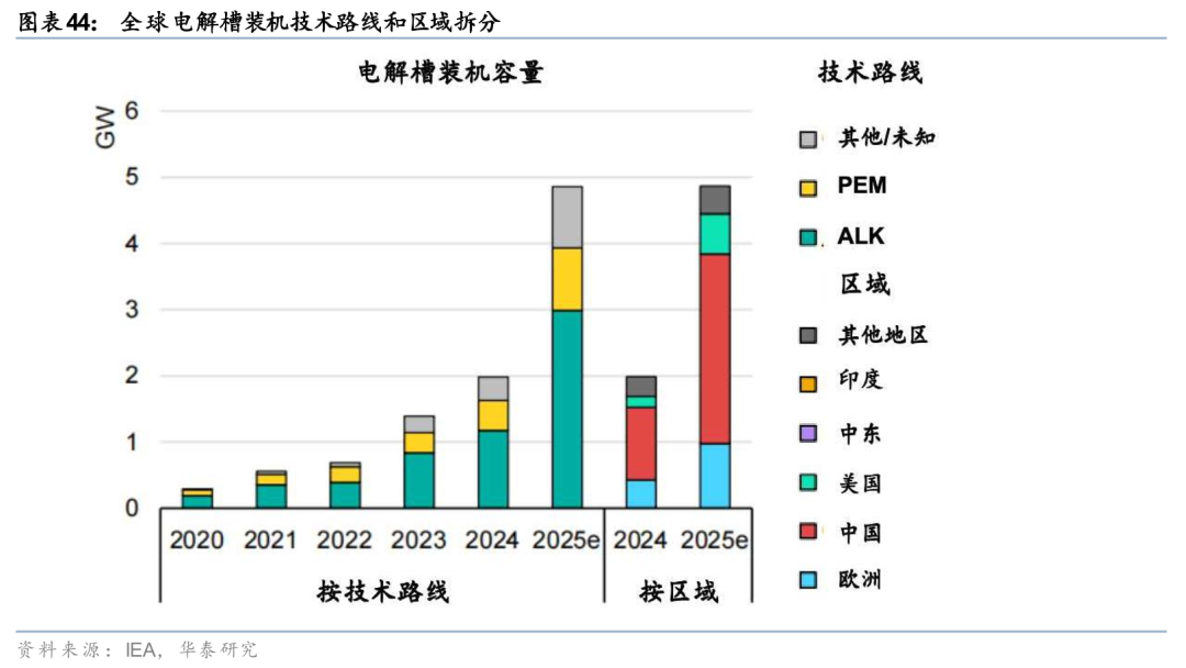 电解槽产能领先进一步强化供应链优势,根据EIA,截至2024年,中国贡献全球电解槽装机约65%,并占全球电解槽生产产能的60%。从全球电解槽技术路线来看,主流方案是碱性水电解槽(ALK)和质子交换膜水电解槽(PEM)。其中ALK通过碱性电解液传导离子完成水分解反应,技术成熟、成本相对较低;PEM利用高分子膜传导质子,实现高纯度氢气制备,具备响应快、适配波动电力的优势。此外固体氧化物电解槽(SOEC,通过高温氧离子导体实现水分解)和阴离子交换膜水电解槽(AEM,仍处于示范阶段)两类新兴技术亦逐步发展。根据IEA,2024年全球电解槽累计装机约2GW,其中ALK和PEM占比分别约60%、20%。中国基于ALK技术优势,目前已经实现产能全球领先。根据中关村氢能产业联盟,截至2024年国内电解槽产能约48GW,其中ALK产能39GW,占比超过80%。