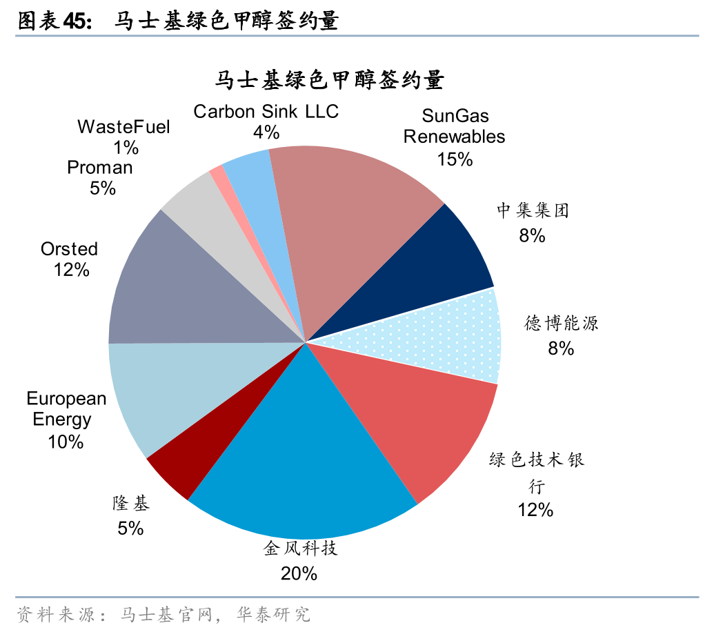 3. 绿色燃料方面,中国前瞻的产能布局和规模化供给能力使得相关企业在海外供应中占据一席之地。马士基船用绿醇采购签约量总计约252万吨,中国企业贡献超过50%,且大部分将在2025-26年启动交付。航空SAF方面,根据EASA和英国最新《SAF授权指令》,欧盟、英国供应SAF使用的原料中,中国贡献占比38%、 74%。