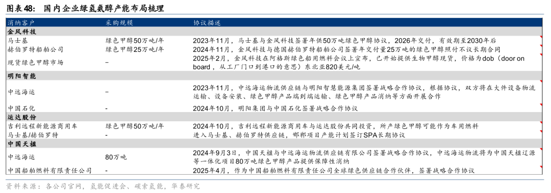 1. 项目运营商:参与绿氢氨醇项目落地生产的运营商将最直接受益于绿氢补贴等政策驱动下的需求放量,其中下游消纳方向落地的企业有望率先受益。根据香橙会,截至2025年底,国内绿氢运行和规划产能总计504、3740、953万吨(不包含未备案项目),头部企业项目推进节奏清晰、规模持续放大。我们自下而上梳理各企业绿氢产能,其中金风科技绿氢、绿醇、绿氨产能布局约60、265、40万吨,位居市场龙头;此外,明阳智能、运达股份、复洁科技等陆续推进并投产数十万吨至百万吨级绿氢氨醇项目。从下游消纳看,2023-24年,马士基、德国赫伯罗特船舶分别与金风科技签署年供50、25万吨绿色甲醇的长期采购协议,同时国内项目运营商与中远海运、吉利汽车、中国石化等下游客户签署战略协议。