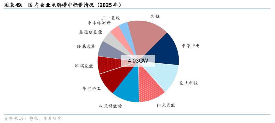 3. 电解槽设备供应商:尽管国内电解槽厂商竞争较为激烈,但考虑到中国ALK碱性电解槽产能和技术优势,未来或将受益于全球绿氢氨醇产业需求。根据氢能聚焦公众号,截至2025年国内电解槽产能约58GW;而全年电解槽中标量仅4.03GW,市场竞争仍较为激烈。市场前十大厂商占总中标量约85%,阳光电源、隆基绿能、双良节能、华电重工位居前列。我们认为国内电解槽企业龙头基于ALK碱性电解槽的技术优势与规模化应用降本,未来有望受益于全球绿氢产业需求景气向上。
