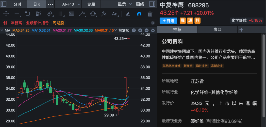 碳纤维概念集体高开,吉林碳谷涨逾20%,吉林化纤、中复神鹰涨停。中复神鹰3月12日早间公告,近日公司全新推出SYT80(T1200级)碳纤维新品,实现SYT80碳纤维的百吨级制备。
