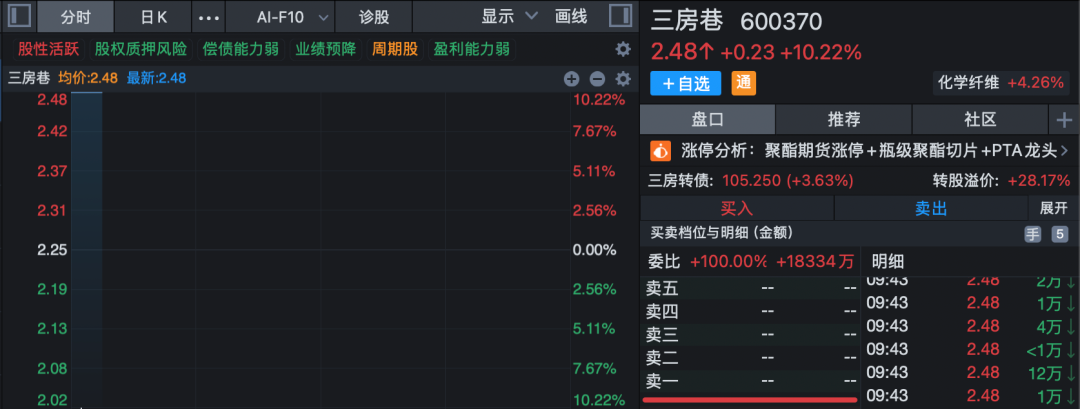 受油价飙涨带动,化工板块大爆发。三房巷涨停,金牛化工、中盐化工、金浦钛业、桐昆股份、中泰化学、怡达股份高开。