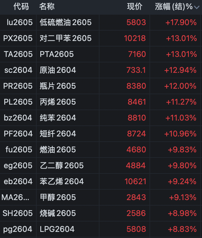 期货方面,化工多个期货主力合约暴涨。低硫燃油主力合约涨超17%;对二甲苯、PTA主力合约触及涨停,涨幅为13%;瓶片主力合约触及涨停,涨幅12%;丙烯、纯苯、短纤涨超10%。