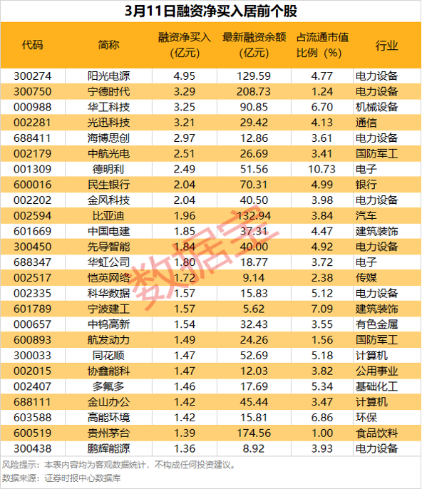 阳光电源融资净买入额居首,当日净买入4.95亿元;其次是宁德时代、华工科技,融资净买入金额分别为3.29亿元、3.25亿元。融资净买入金额居前的还有光迅科技、海博思创、中航光电等。