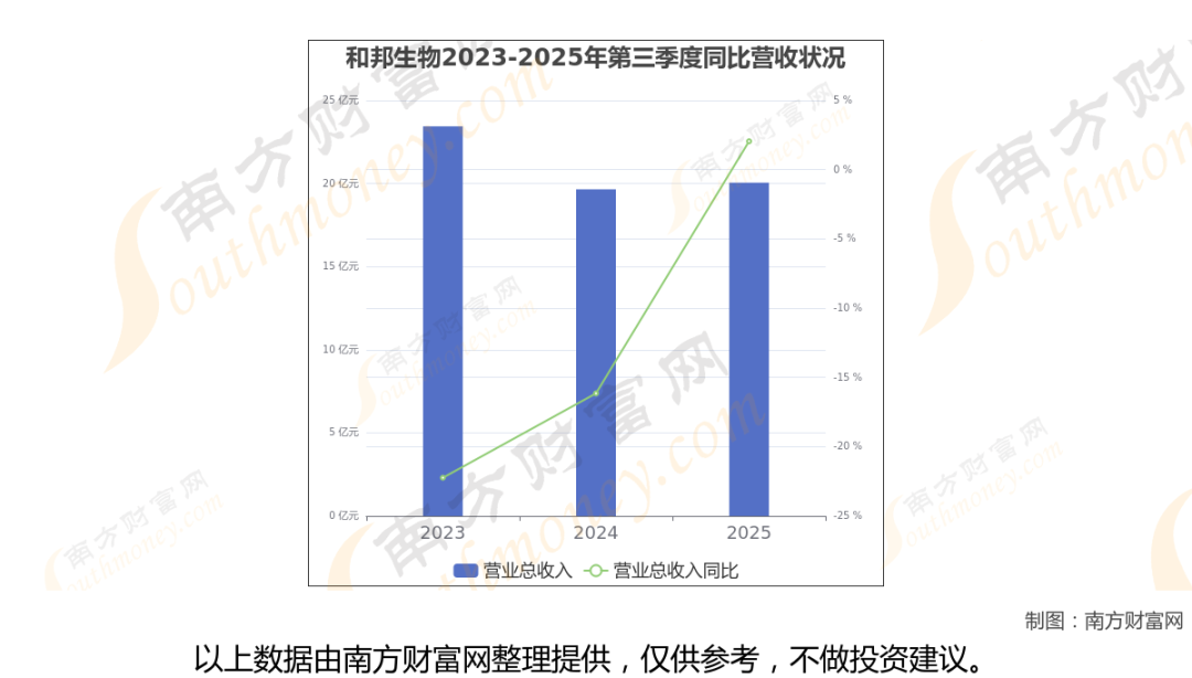 于2025年第三季度,和邦生物披露了其业绩表现(如上图),其中主营业务收入20.05亿元,相较于去年同期2.05%。