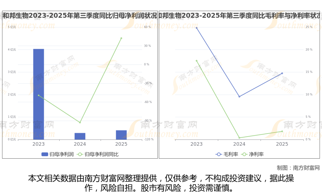公司2025年第三季度季报显示,和邦生物实现净利润4133.7万,同比增长42.3%;毛利润为2.95亿,毛利率14.73%。