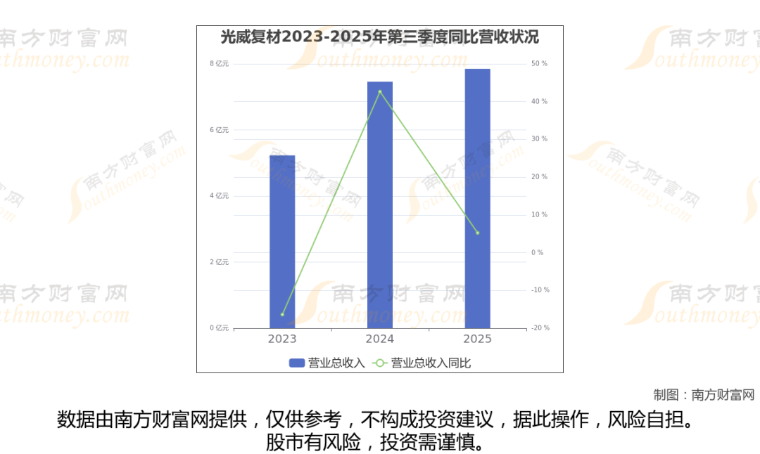 在2025年第三季度,光威复材的业绩表现(如上图),主营业务收入达到7.85亿元,实现了5.24%的同比增长率。