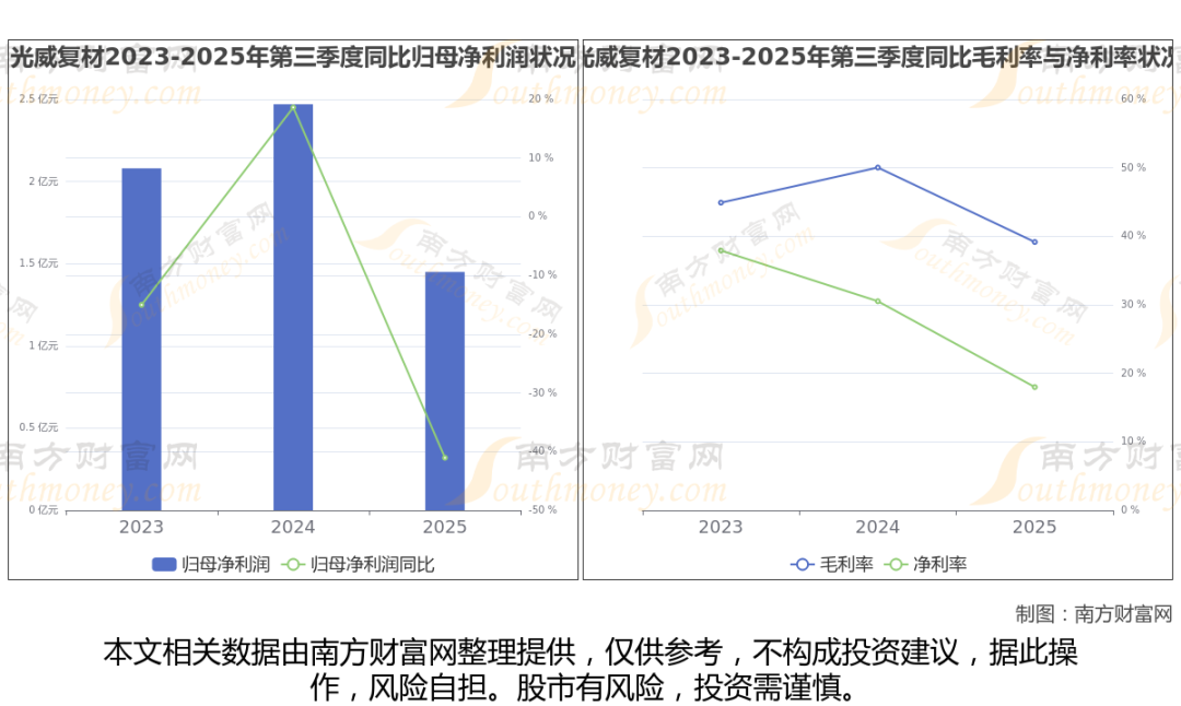 2025年第三季度季报显示,光威复材公司实现净利润1.45亿,同比上年增长率为-41.05%,毛利率39.17%,归属净利润1.45亿,同比增长-41.05%。