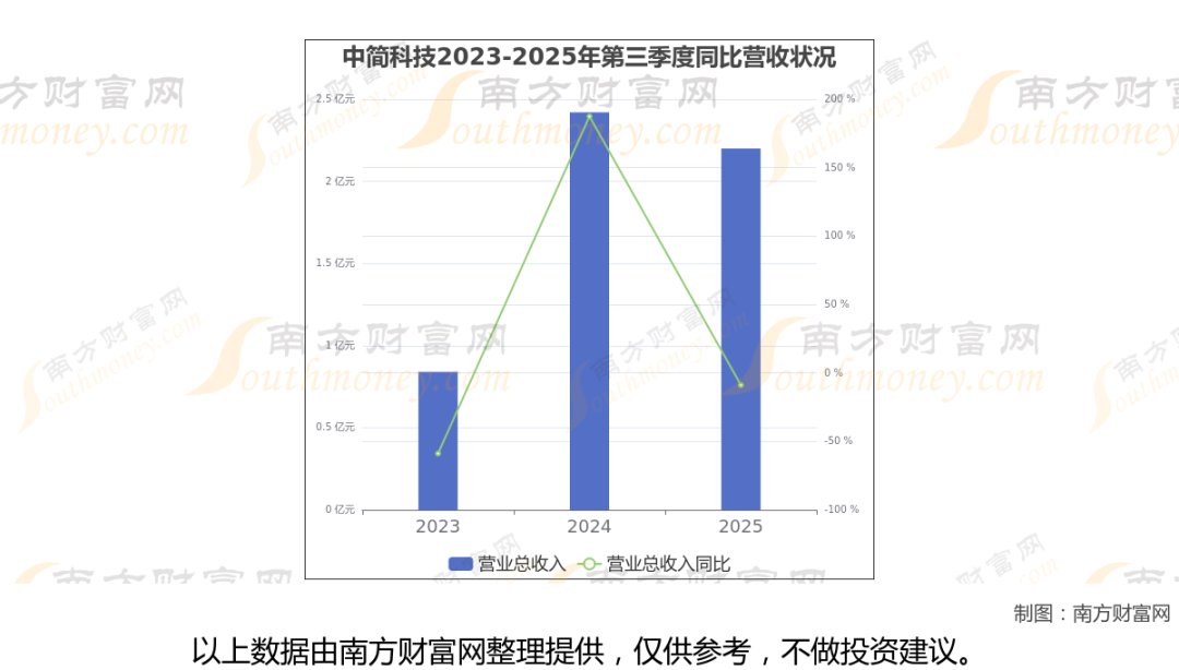 中简科技2025年第三季度报告显示(如上图),公司实现主营业务收入2.2亿元,较去年同期增长-8.85%。
