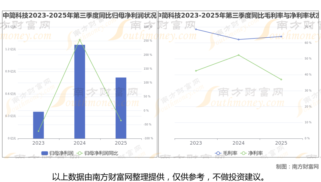 2025年第三季度季报显示,中简科技公司实现净利润8153.25万,同比增长-35.55%;毛利润为1.41亿,毛利率63.99%。