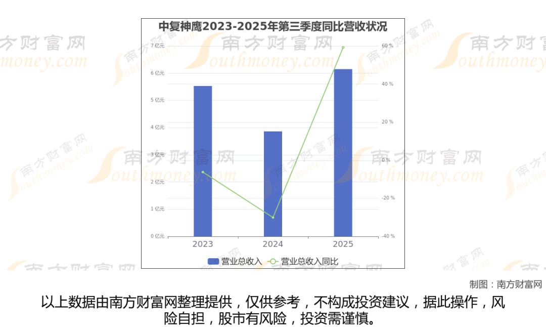 (如上图)中复神鹰披露2025年第三季度报告,报告期实现营收6.15亿元,同比59.23%。