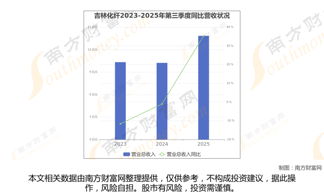 于2025年第三季度,吉林化纤披露了其业绩表现(如上图),其中主营业务收入13.84亿元,相较于去年同期35.35%。