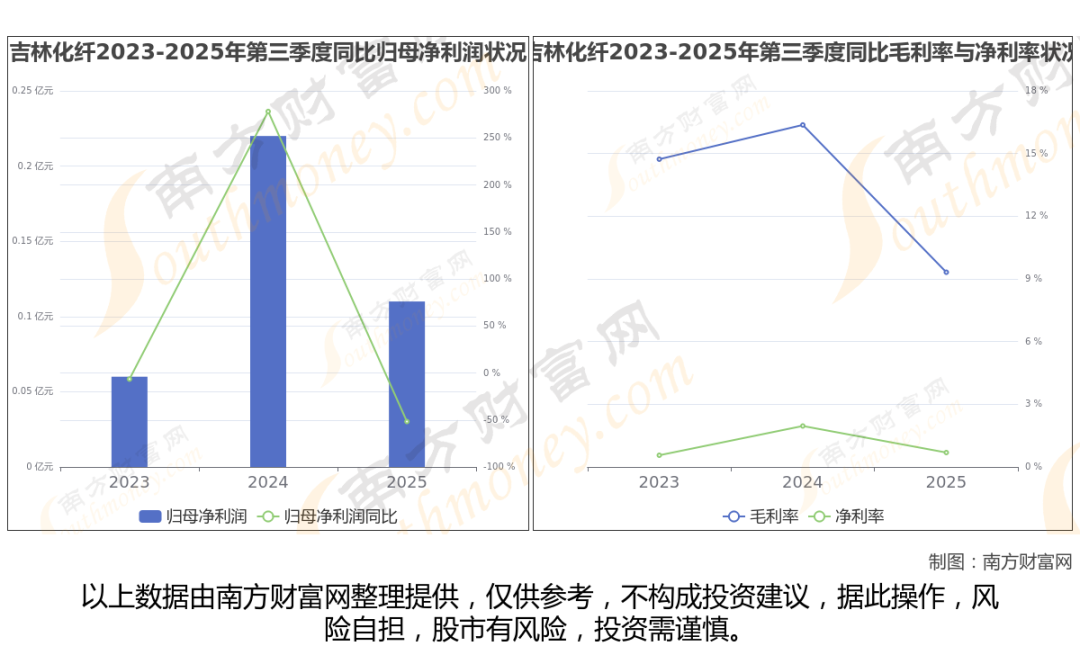 2025年第三季度季报显示,吉林化纤公司实现净利润1058.03万,同比上年增长率为-51.69%,毛利率9.32%。