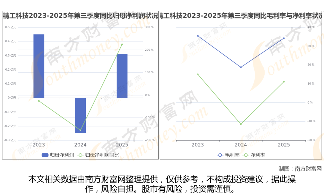 2025年第三季度季报显示,精工科技公司实现净利润3129.12万,同比上年增长率为224.44%,毛利率34.21%。